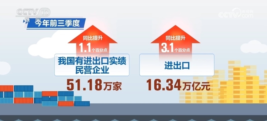 2023年前三季度,我國有進(jìn)出口實(shí)績的民營企業(yè)51.18萬家,進(jìn)出口16.34萬億元,分別占整體的85.7%、53.1%,同比分別提升1.1個、3.1個百分點(diǎn)。