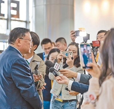 10月17日,參加“一帶一路”企業(yè)家大會的代表在接受媒體采訪。本報記者 伊 霄攝