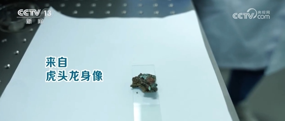 四川省文物考古研究院館員 肖慶:這件樣品是從8號坑的虎頭龍身像上取下來的樣品。這件器物的特別之處就是在它的底座上,有很多紅顏色類似顏料樣的東西?,F在要做的就是來確定這個紅色的顏料到底是什么物質。