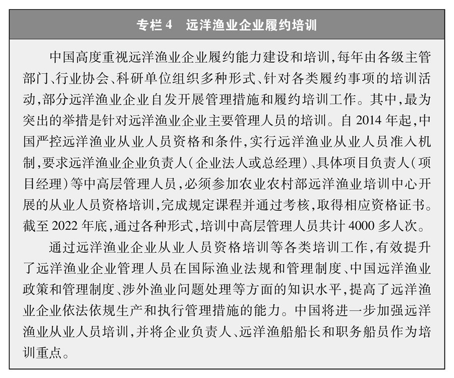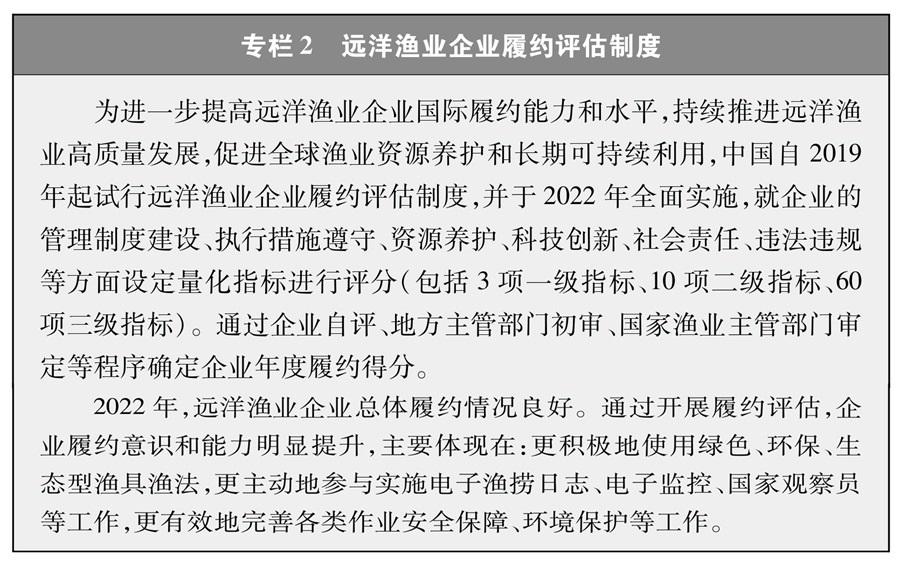 遠洋漁業(yè)企業(yè)和漁船是履行國際公約、合法合規(guī)從事漁業(yè)生產(chǎn)的主體。2022年中國正式實施遠洋漁業(yè)企業(yè)履約評估制度,將企業(yè)履約成績與行政審批、政策支持等掛鉤,通過正向激勵、反向倒逼的方式,引導(dǎo)企業(yè)不斷完善管理制度,嚴格執(zhí)行管理措施,避免發(fā)生違規(guī)行為,切實提高履約能力。這一制度有力促進了遠洋漁業(yè)企業(yè)規(guī)范管理和國際履約,得到了各方關(guān)注和廣泛認可。