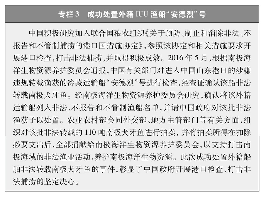 堅決支持并積極配合國際社會打擊各種非法漁業(yè)活動。2020年起,中國每年派遣執(zhí)法船赴北太平洋公海開展?jié)O業(yè)執(zhí)法巡航,查處違規(guī)作業(yè)行為。2016年,配合南極海洋生物資源養(yǎng)護委員會成功扣押處置了一艘外籍漁船非法轉(zhuǎn)載南極犬牙魚案件。2018年起,將中國加入的相關(guān)區(qū)域漁業(yè)管理組織公布的非法、不報告和不管制漁船名單通報國內(nèi)各港口,拒絕此類漁船進港以及卸貨、補給、加油等活動。