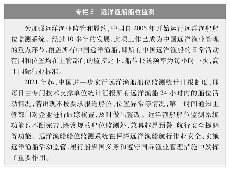 中國對遠洋漁船實施全球最嚴的船位監(jiān)測管控措施,堅持“零容忍”打擊非法捕撈。通過強化監(jiān)管、完善機制、提升能力等措施,推進漁船監(jiān)控等難點問題得到有效治理,船員管理等重點環(huán)節(jié)明顯改善,重點海域監(jiān)管切實加強,推動遠洋漁業(yè)綜合監(jiān)管能力顯著提升,保障遠洋漁業(yè)生產(chǎn)秩序總體穩(wěn)定。
