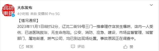 ·遼寧省沈陽市大東區(qū)遼沈二街59號三門一推拿理療店發(fā)生爆燃,店內(nèi)一人受傷。