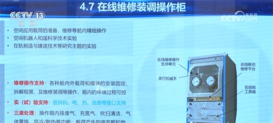 中國(guó)科學(xué)院空間應(yīng)用工程與技術(shù)中心研究員 張璐:其他的(實(shí)驗(yàn)柜)都屬于科學(xué)實(shí)驗(yàn)柜,都會(huì)有一個(gè)或者多個(gè)比較固定的研究主題。這個(gè)實(shí)驗(yàn)柜實(shí)際上更多的是一個(gè)支撐類(lèi)的實(shí)驗(yàn)柜,它并沒(méi)有一個(gè)比如說(shuō)像生命科學(xué)、流體科學(xué)這方面的專(zhuān)一的、獨(dú)立的一個(gè)研究方向。以前的時(shí)候,有些(設(shè)備)比如說(shuō)壞了,航天員不是很方便地去進(jìn)行在軌的一些維修和更換。這個(gè)在線實(shí)際上就是指在軌的狀態(tài)下,航天員可以對(duì)其他的科學(xué)實(shí)驗(yàn)柜,包括其他的空間應(yīng)用系統(tǒng)的一些載荷裝置更換、維修,或者有操作需求的時(shí)候,這個(gè)實(shí)驗(yàn)柜提供了一系列包括結(jié)構(gòu)安裝、潔凈空間的處理,包括還有機(jī)械臂(手)的輔助操作,相應(yīng)的一些真空、排廢氣,很多工具類(lèi)的支撐,來(lái)保障這些維修操作能夠在軌順利展開(kāi)。