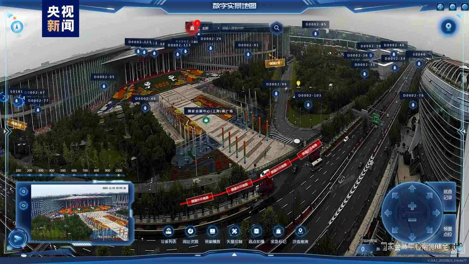 為強(qiáng)化精準(zhǔn)指揮調(diào)度,消防部門專門制作了國家會展中心的三維模型,將本屆參展的1888個展位全部進(jìn)行了數(shù)字化標(biāo)識,在指揮平臺主頁面可實現(xiàn)目標(biāo)展位一鍵搜索和快速定位。以6.1號館為試點,通過激光雷達(dá)和可見光融合傳感器進(jìn)行快速掃描,建立展臺的三維精模,配置安保模型算法,將現(xiàn)場監(jiān)控攝像頭傳回的二維畫面與三維模型匹配,實現(xiàn)虛實場景交互融合。同時通過采集巡館人員面部、著裝等特征信息,利用AI算法,實時在館內(nèi)人群中標(biāo)定巡館人員,進(jìn)行精準(zhǔn)定位。一旦發(fā)現(xiàn)異常狀況,指揮部值班人員能快速、精準(zhǔn)地向所有駐防人員提供最佳處置線路指引和最優(yōu)輔助決策。