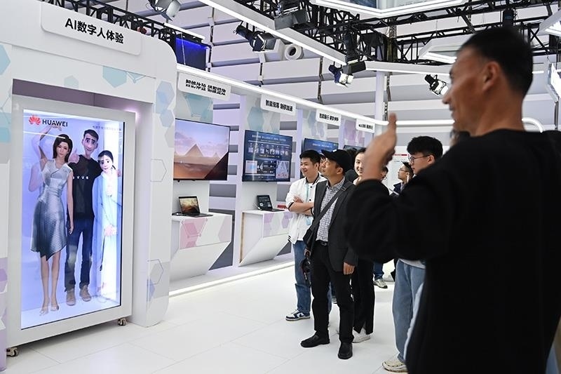 △2023年11月7日,2023年世界互聯(lián)網(wǎng)大會“互聯(lián)網(wǎng)之光”博覽會在浙江烏鎮(zhèn)開幕。圖為觀眾在展臺體驗與AI數(shù)字人合影。