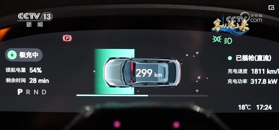 總臺央視記者 高媛:動力電池被稱為新能源汽車的“心臟”,而15分鐘就是這輛車充70%的電所需要的時間,它的“秘訣”就是搭載了最新型號的電池。