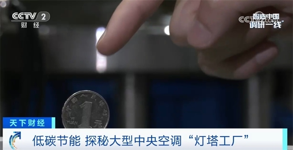 我現(xiàn)在走進的這個區(qū)域是空調(diào)產(chǎn)線的末端——檢測平臺。每一臺空調(diào)出廠前都要在這里經(jīng)過全方位的檢測。眼前這就是一臺正在運轉(zhuǎn)的氣懸浮中央空調(diào),我們在空調(diào)上立了一枚硬幣,可以看到是紋絲不動的,這也是氣懸浮的特點之一——運行比較平穩(wěn)。在這塊屏幕上顯示著空調(diào)的出水溫度7℃,恒定的出水溫度讓這臺空調(diào)產(chǎn)生的冷風非常柔和。目前,這座工廠全流程的自動化生產(chǎn)能夠滿足從小型商用空調(diào)生產(chǎn)到用戶需求的大規(guī)模定制。目前低能耗、智能化產(chǎn)品已應(yīng)用在商業(yè)地產(chǎn)、酒店、軌道交通等各種場景,極大程度助力著國家“雙碳”政策以及各大行業(yè)的低碳轉(zhuǎn)型。