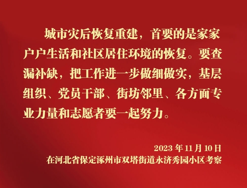 11月10日,中共中央總書記、國家主席、中央軍委主席習近平在北京、河北考察災后恢復重建工作。他先后來到門頭溝、保定等地,實地了解災后恢復重建情況。