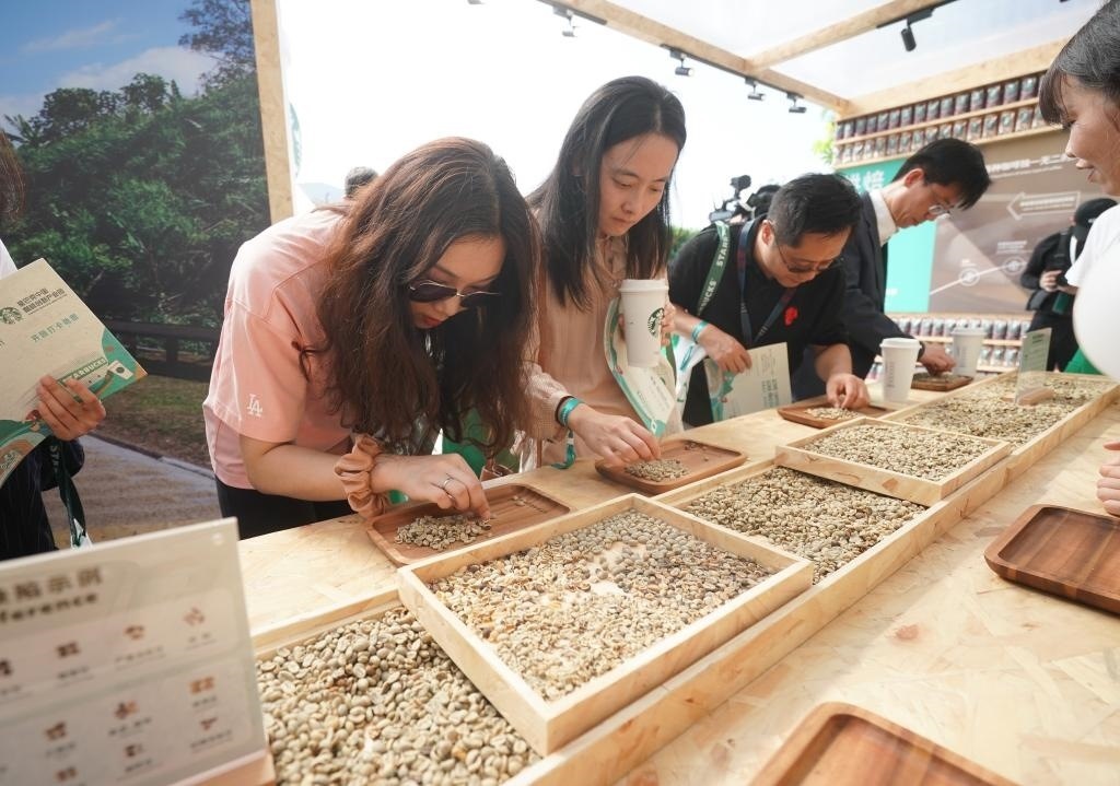 9月19日,在星巴克中國咖啡創(chuàng)新產(chǎn)業(yè)園開園儀式現(xiàn)場,來賓在體驗挑揀咖啡生豆。當(dāng)日,星巴克中國咖啡創(chuàng)新產(chǎn)業(yè)園在江蘇昆山落成投產(chǎn)。