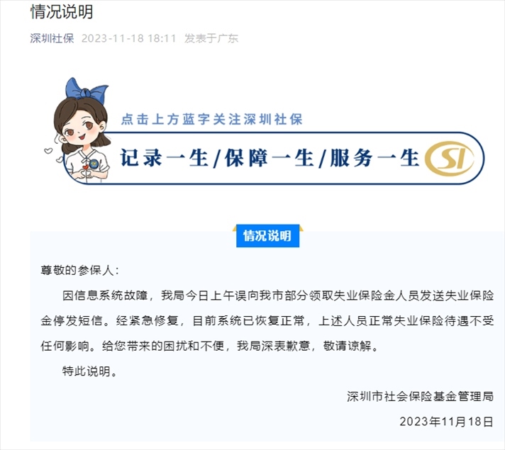 ·深圳社保局回應(yīng)停發(fā)失業(yè)保險(xiǎn)金短信:信息系統(tǒng)故障,已恢復(fù)正常。