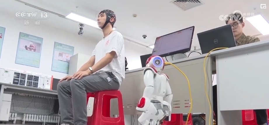 記者來到這間研發(fā)人形機(jī)器人的實驗室時,科研團(tuán)隊正在測試機(jī)器人的同步能力。眼前的機(jī)器人不僅可以通過攝像頭,捕捉人們的動作后進(jìn)行同步模仿,還可以通過腦機(jī)接口、肌電交互等方式,捕捉人們的腦電信息和運(yùn)動意圖,直接同步控制機(jī)器人的行為。