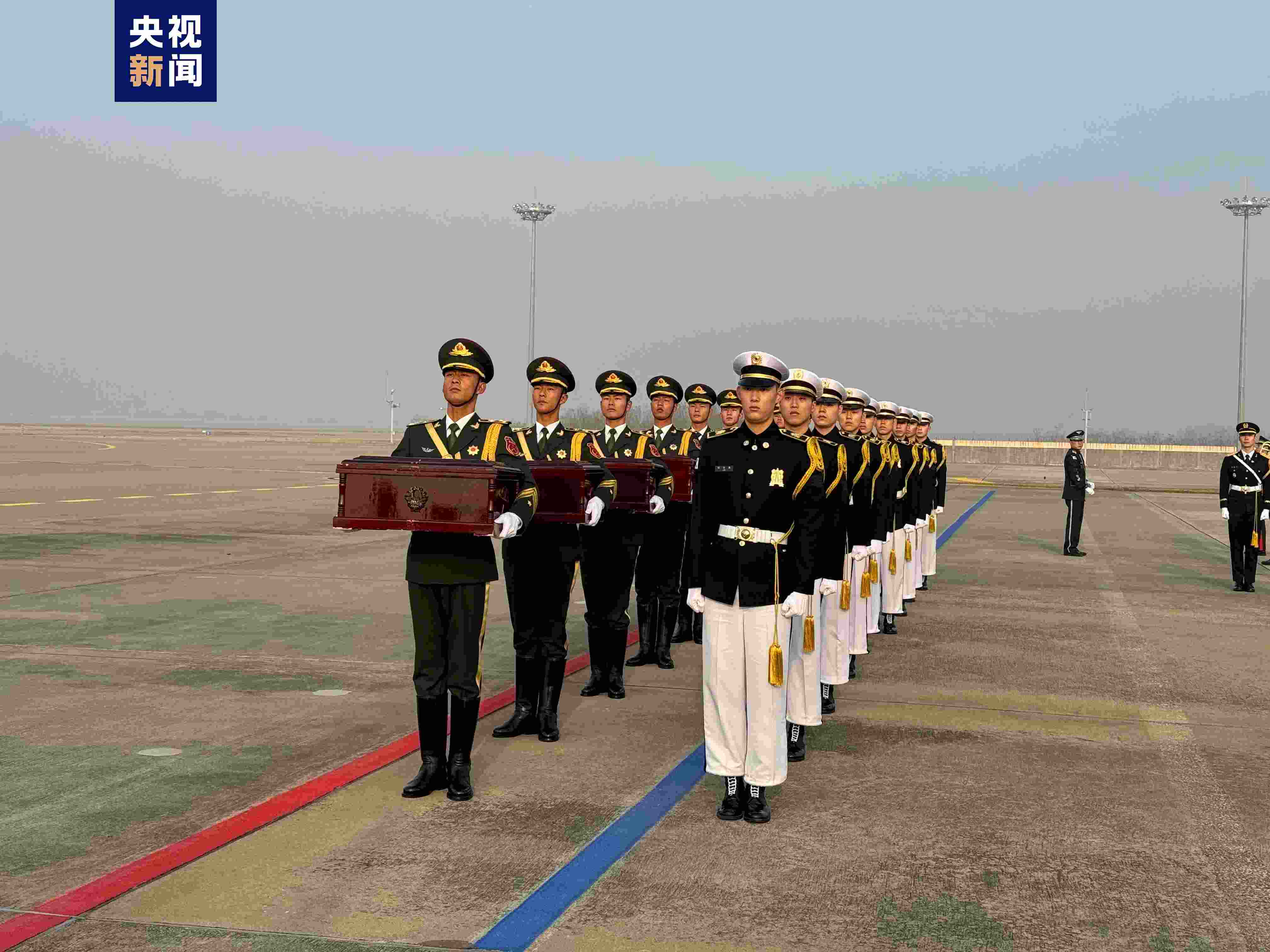當?shù)貢r間23日上午,中韓雙方在韓國仁川國際機場舉行第十批在韓中國人民志愿軍烈士遺骸及遺物交接儀式。此次韓方共向中方移交25名中國人民志愿軍烈士遺骸及335件遺物,交接儀式后烈士遺骸將搭乘中國空軍運-20專機返回祖國。