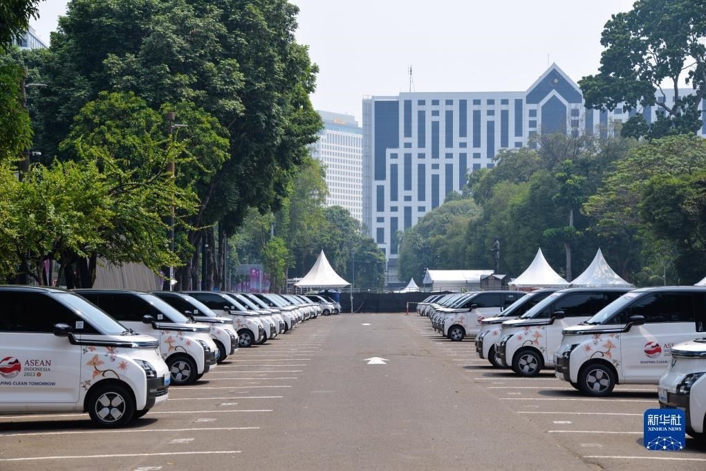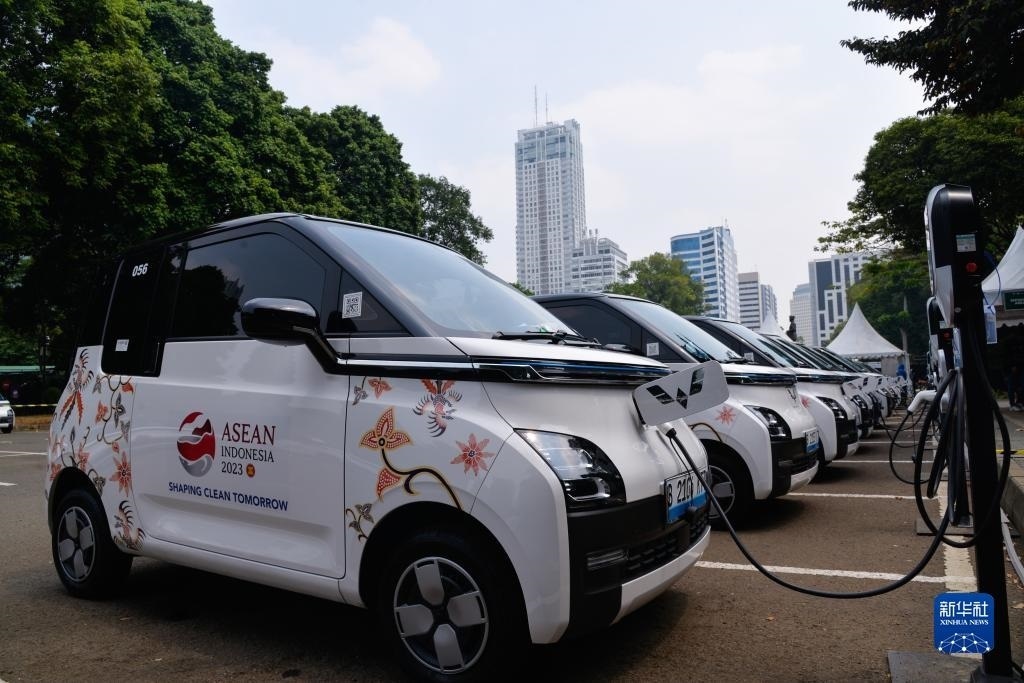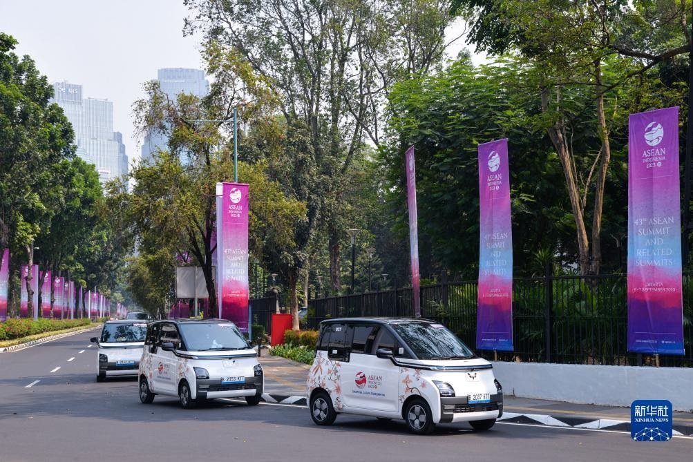 這是9月6日在印度尼西亞雅加達(dá)第43屆東盟峰會(huì)會(huì)場外拍攝的五菱新能源車Air ev。新華社記者 徐欽 攝