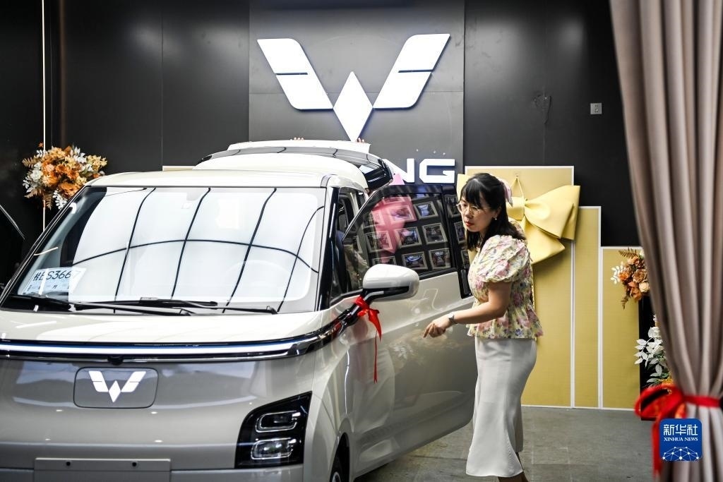 10月1日,在印度尼西亞雅加達(dá)一家商場,人們在體驗(yàn)一輛五菱新能源車Air ev(手機(jī)照片)。新華社記者 徐欽 攝