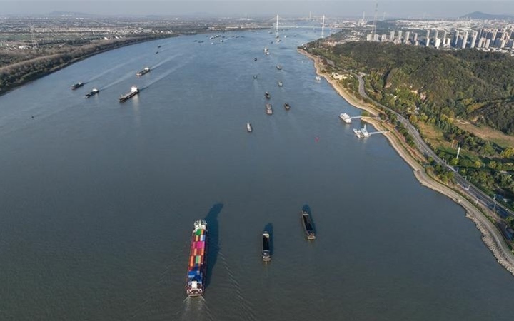 船只行駛在長江南京段(11月2日攝,無人機(jī)照片)。記者 季春鵬 攝