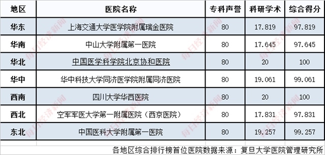 分地區(qū)看,中國醫(yī)學(xué)科學(xué)院北京協(xié)和醫(yī)院和四川大學(xué)華西醫(yī)院分別以??坡曌u(yù)(80)、科研學(xué)術(shù)(20)雙滿分的成績領(lǐng)跑華北地區(qū)、西南地區(qū)的綜合排行榜,中國醫(yī)科大學(xué)附屬第一醫(yī)院和華中科技大學(xué)同濟(jì)醫(yī)學(xué)院附屬同濟(jì)醫(yī)院則分別以99.257和99.061的成績領(lǐng)跑東北地區(qū)和華中地區(qū)。此外,上海交通大學(xué)醫(yī)學(xué)院附屬瑞金醫(yī)院、中山大學(xué)附屬第一醫(yī)院、空軍軍醫(yī)大學(xué)第一附屬醫(yī)院(西京醫(yī)院)也分別在各地區(qū)的綜合排行榜中位列首位。
