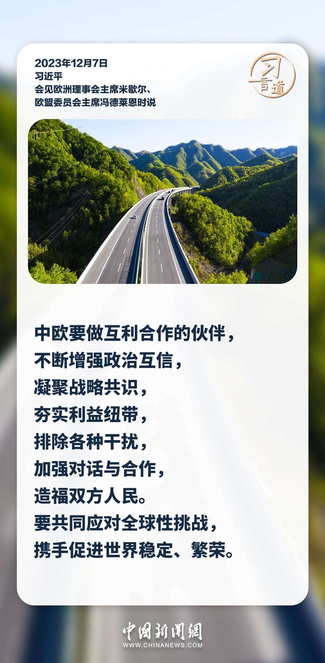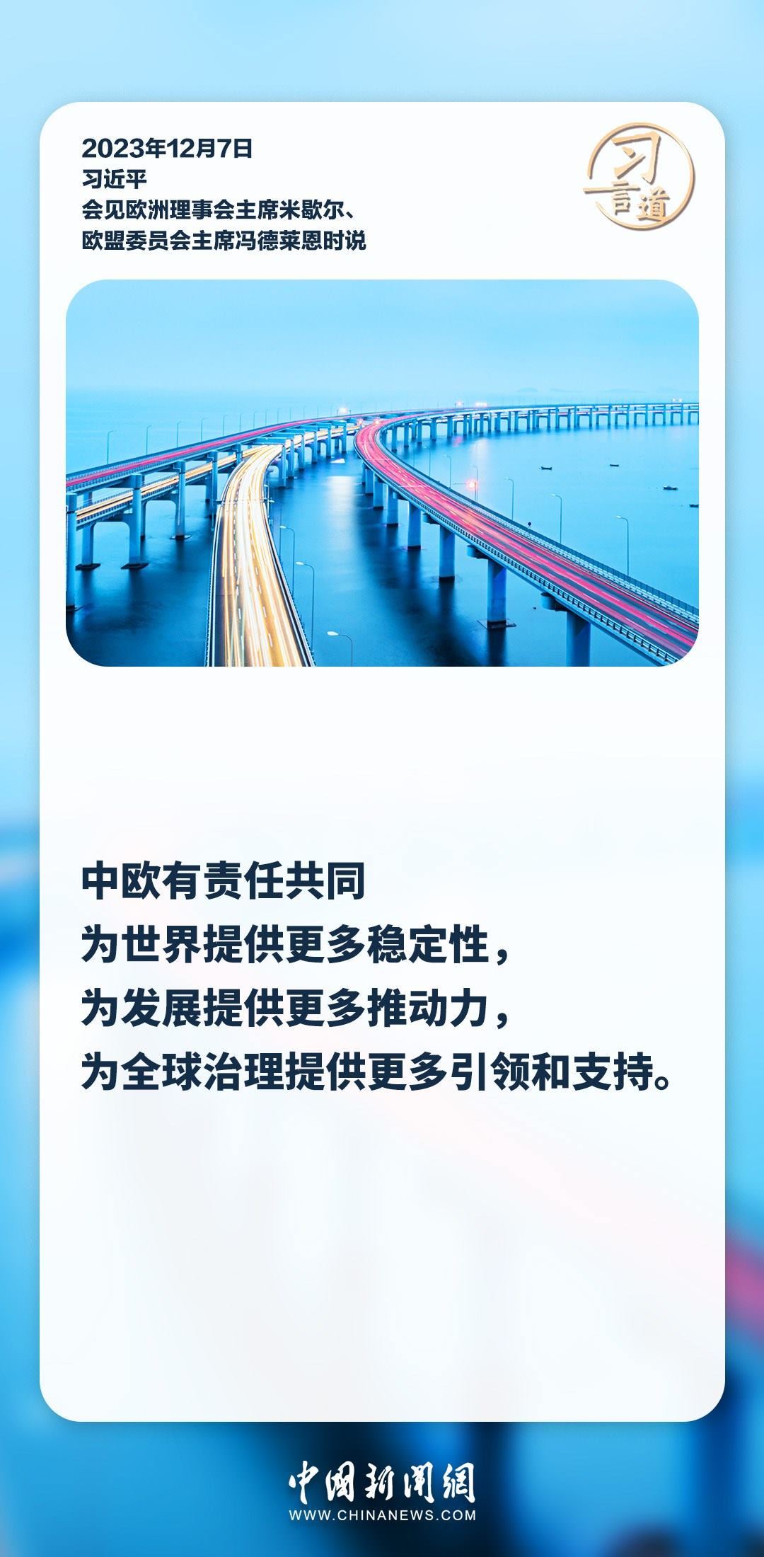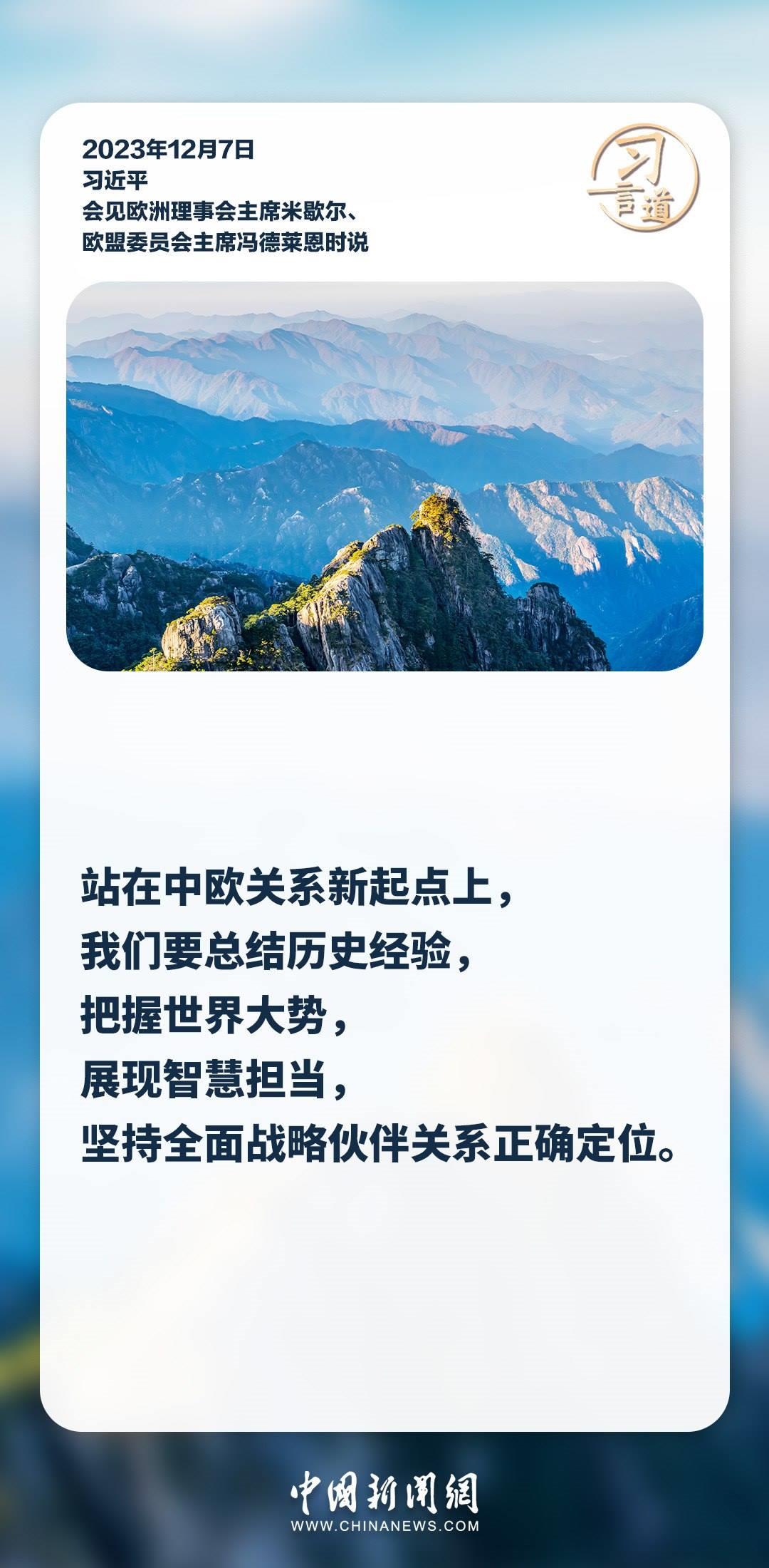 12月7日,國家主席習近平在釣魚臺國賓館會見來華舉行第二十四次中國—歐盟領導人會晤的歐洲理事會主席米歇爾和歐盟委員會主席馮德萊恩。習近平說——