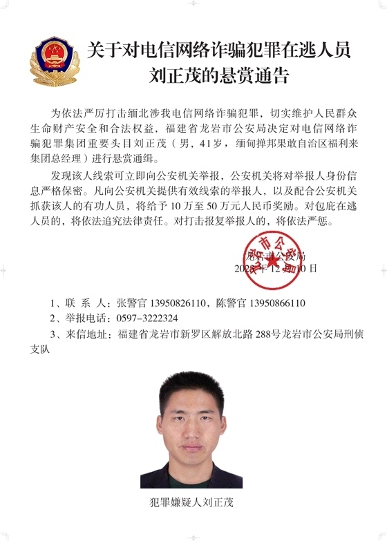 為依法嚴(yán)厲打擊緬北涉我電信網(wǎng)絡(luò)詐騙犯罪,切實(shí)維護(hù)人民群眾生命財(cái)產(chǎn)安全和合法權(quán)益,遼寧省大連市公安局決定對(duì)白所成、白應(yīng)蒼(又名李云晨)、白應(yīng)蘭(又名李夢(mèng)娜)進(jìn)行公開懸賞通緝;福建省泉州市公安局決定對(duì)魏懷仁、魏榕(又名陳榕)、魏青松(又名楊松)進(jìn)行公開懸賞通緝;福建省龍巖市公安局決定對(duì)劉正祥、劉積光(又名李華光)、劉正茂進(jìn)行公開懸賞通緝;重慶市公安局決定對(duì)徐老發(fā)(又名徐發(fā)啟)進(jìn)行公開懸賞通緝。