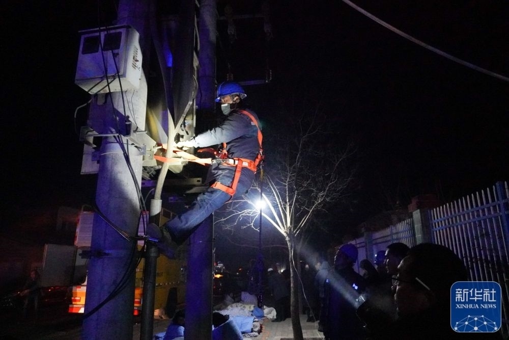 12月19日,在甘肅省臨夏回族自治州積石山保安族東鄉(xiāng)族撒拉族自治縣中西醫(yī)結(jié)合醫(yī)院門口,電力部門工作人員搶修電力設(shè)施。新華社記者 馬希平 攝