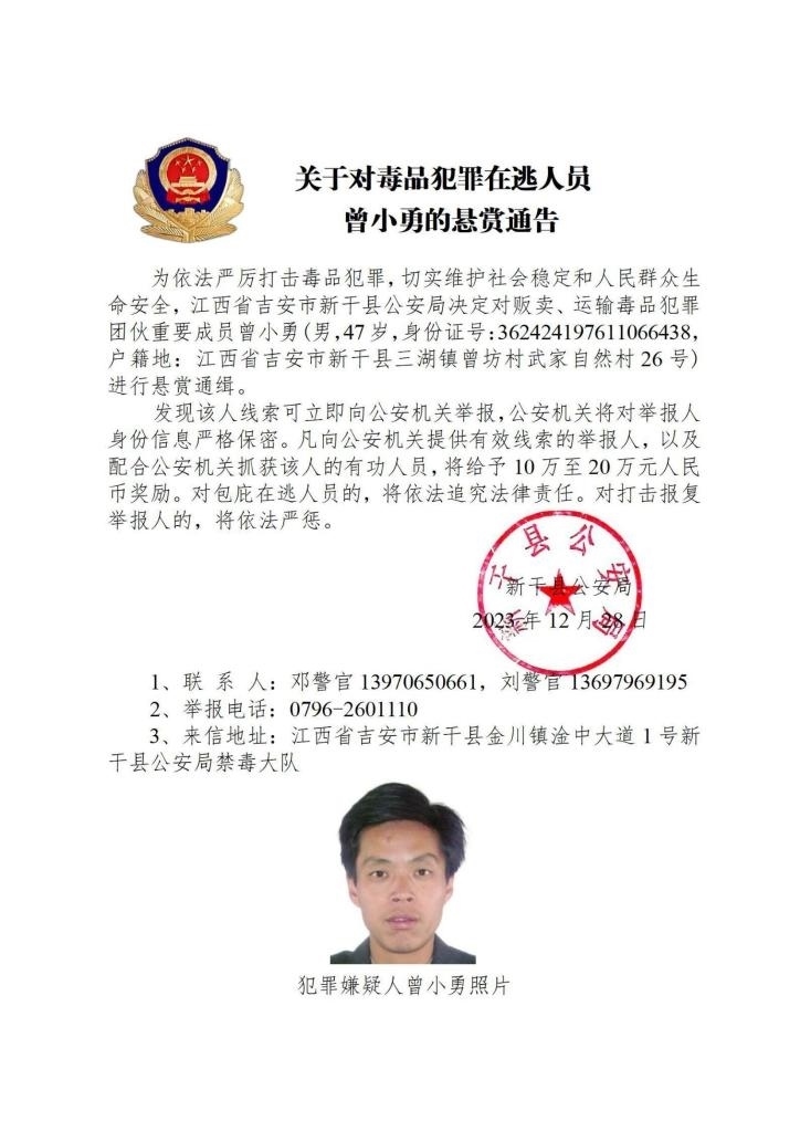其中,湖南省郴州市公安局決定對張安龍、馬文祥、吳玉楊進行公開懸賞通緝;湖南省株洲市公安局決定對楊金梅進行公開懸賞通緝;江西省新干縣公安局決定對曾小勇、李國平、孫強進行公開懸賞通緝;浙江省溫州市公安局決定對顏歡平進行公開懸賞通緝;四川省遂寧市公安局決定對母朝東進行公開懸賞通緝;貴州省黔東南州公安局決定對龍華進行公開懸賞通緝。