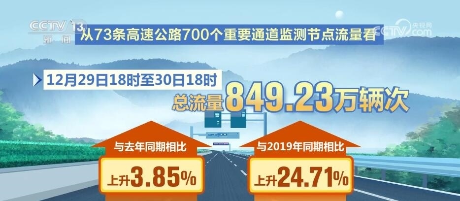 從公安部交管局選取的73條高速公路700個(gè)重要通道監(jiān)測(cè)節(jié)點(diǎn)流量看,12月29日18時(shí)至30日18時(shí)總流量849.23萬(wàn)輛次,與去年同期相比上升3.85%,與2019年同期相比上升24.71%;從53條國(guó)道300個(gè)重要通道監(jiān)測(cè)節(jié)點(diǎn)流量看,12月29日18時(shí)至30日18時(shí)總流量183.01萬(wàn)輛次,與去年同期相比上升21.37%,與2019年同期相比上升53.57%。