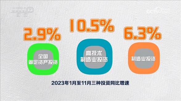 從投資看,2.9%、6.3%、10.5%,這三個(gè)數(shù)字分別是今年1—11月全國(guó)固定資產(chǎn)投資、制造業(yè)投資和高技術(shù)制造業(yè)投資的同比增速。