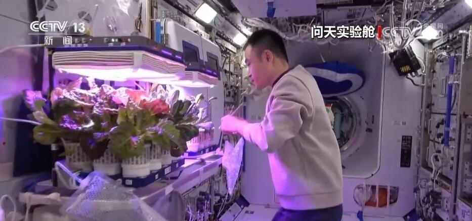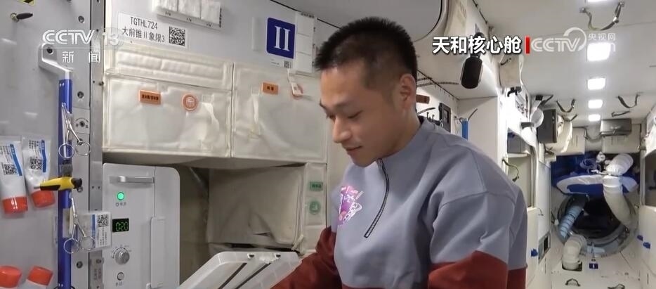 航天員 唐勝杰:你好,我正在對我們的櫻桃番茄進(jìn)行授粉。因為太空沒有小蜜蜂,我就是那只小蜜蜂。大家看一看,這是我們的太空蔬菜,神十七乘組在“太空出差”期間,我們的太空菜園變得更大了,大家看看我們的蔬菜是不是長勢喜人?今天是新年的第一天,江新林為我們準(zhǔn)備了營養(yǎng)豐盛的太空午餐,但是我覺得今天應(yīng)該再增加一點綠色的、新鮮的蔬菜,午餐就會變得更豐盛了。大家可以看一看,看看我們的櫻桃番茄。誒,拿這兩杯,今天中午我們就吃這兩杯。