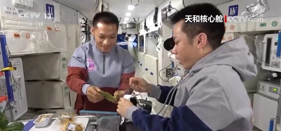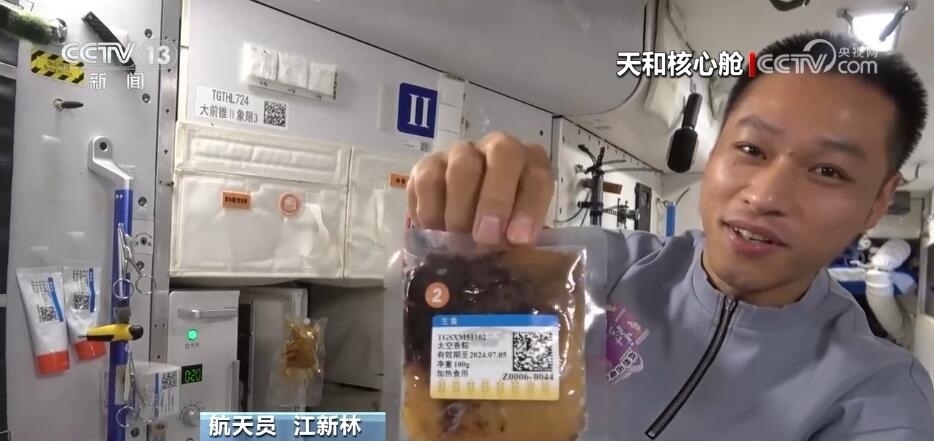 航天員 江新林:我是今天的太空美食家,讓我?guī)ьI(lǐng)大家一起來探索發(fā)現(xiàn)今天的太空美食。我們先看一下主食,熱乎乎的,看看里面都有什么吧,有01最愛吃的白米飯,小心燙哦,02愛吃的面條,我的炒飯。好了,把它粘在餐桌上。然后再讓我們看看我為他們準(zhǔn)備的驚喜。看看這是什么?這是我們冬至特意結(jié)余的餃子,還有蔬菜副食。地面上的工作人員考慮得特別周到,按照個人的口味為我們準(zhǔn)備了美味的食品,而且將它們塑封包裝,給我們節(jié)余時間的時候又保證它的口味。這是網(wǎng)紅太空香粽,大家印象比較深刻吧,還有這個年糕也是特別好吃、特別美味,還有紅燴豬排,保證有足夠的蛋白質(zhì)攝入量。很豐盛。請看這里,我們特意留了一些新鮮的水果,看看都有什么吧,有美味的蘋果,還有葡萄,大家這個都特別愛吃,我們?nèi)齻€在一起分享一下。