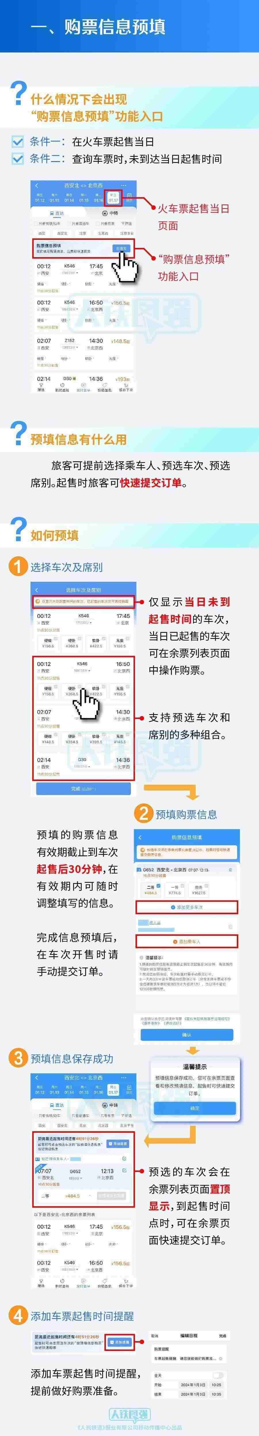 旅客朋友可于車(chē)票起售當(dāng)日,預(yù)先填寫(xiě)乘車(chē)人、車(chē)次、席別等信息,在車(chē)票開(kāi)始發(fā)售時(shí)一鍵提交訂單并完成支付,使旅客購(gòu)票更便捷。