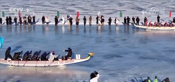 14日下午2點,在松花江哈爾濱江段已經(jīng)封凍的江面上,一場別開生面的冰上龍舟賽在數(shù)千名觀眾的注視下上演,冰上劃龍舟,對于遠(yuǎn)道而來的廣東順德龍舟隊隊員們來說卻是前所未有的體驗。