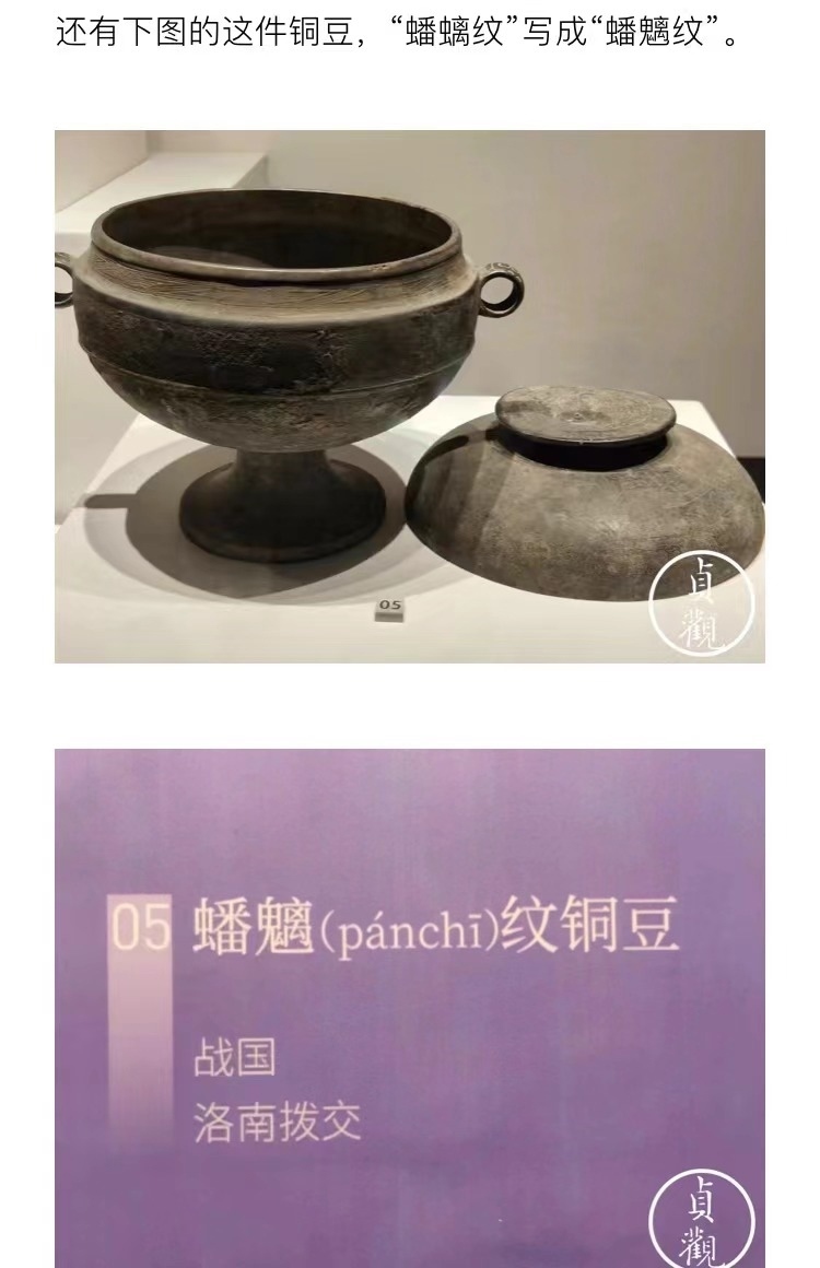 文章稱,秦漢館中很多展品不僅沒有英文標(biāo)識,甚至連展品的基本信息都不全,有的文物名稱也被標(biāo)錯(cuò),如:“鷹獸相搏紋飾銅牌飾” 被誤寫為“銅鷹獸權(quán)博牌飾”;介紹一件銅豆的展品信息中,“蟠螭紋”誤寫成“蟠魑紋”。