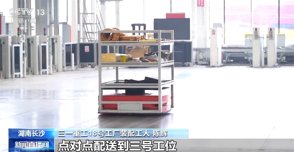 三一重工18號(hào)工廠裝配工人 陳輝:對(duì)于我們一個(gè)組裝工人來(lái)說(shuō),最麻煩的事莫過(guò)于找料和取料。我們過(guò)去都是自己找、自己拿,現(xiàn)在我們都是通過(guò)AGV小車(chē)點(diǎn)對(duì)點(diǎn)配送到三號(hào)工位。