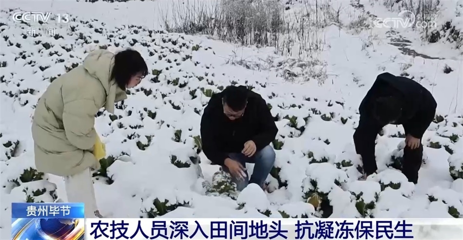 在貴州畢節(jié)螺絲村蔬菜基地,田間地頭白茫茫一片。為應(yīng)對(duì)低溫凝凍天氣,當(dāng)?shù)剞r(nóng)技人員現(xiàn)場(chǎng)查看蔬菜長勢(shì),為農(nóng)戶講解蔬菜防凍知識(shí),指導(dǎo)做好防寒抗凍措施。