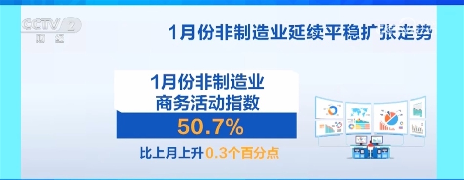 此外,1月份非制造業(yè)商務(wù)活動指數(shù)為50.7%,比上月上升0.3個(gè)百分點(diǎn),延續(xù)平穩(wěn)擴(kuò)張走勢。其中,服務(wù)業(yè)商務(wù)活動指數(shù)升至擴(kuò)張區(qū)間,景氣面也有所擴(kuò)大。在節(jié)日效應(yīng)帶動下,零售、道路運(yùn)輸、餐飲等行業(yè)商務(wù)活動指數(shù)升至擴(kuò)張區(qū)間。郵政、貨幣金融服務(wù)等行業(yè)業(yè)務(wù)量增長較快。