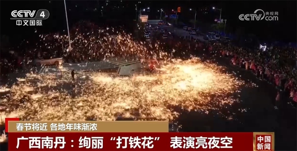 在廣西河池南丹縣,一場(chǎng)絢爛的“打鐵花”非遺表演點(diǎn)亮夜空。一勺勺滾燙的鐵水在匠人的擊打下化作一朵朵鐵花璀璨綻放,市民紛紛拿出手機(jī)拍照打卡,記錄這美麗的瞬間。