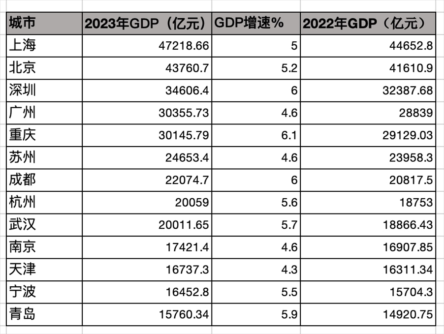 青島2023年則無論從增量還是增速上都成績亮眼——增量近800億高于天津(426億)和寧波(748億);5.9%的增速也高于上海、北京、廣州、杭州、武漢、天津、寧波等城市。