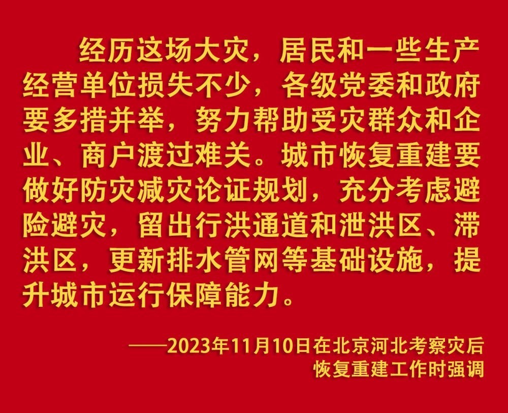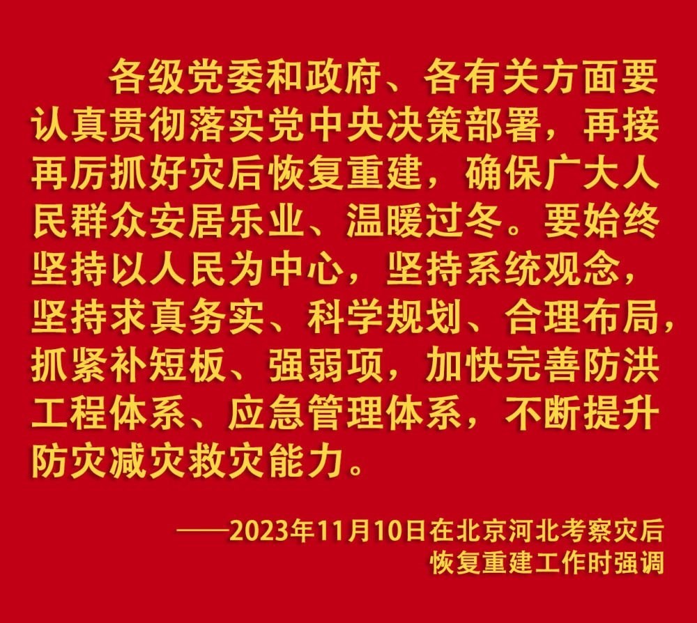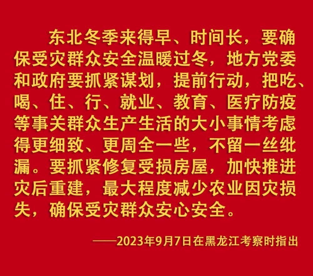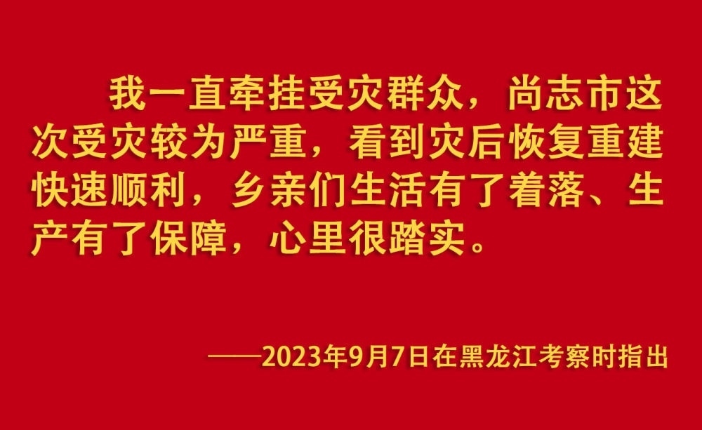 2023年汛期以來(lái),我國(guó)華北、東北等地出現(xiàn)極端降雨,引發(fā)洪澇和地質(zhì)災(zāi)害。習(xí)近平一直牽掛著受災(zāi)群眾,高度重視防汛抗洪救災(zāi)和災(zāi)后恢復(fù)重建工作,多次作出重要指示批示,要求有關(guān)地方和部門(mén)全力保障人民群眾生命財(cái)產(chǎn)安全,盡快恢復(fù)災(zāi)區(qū)正常生產(chǎn)生活秩序。2023年9月上旬,習(xí)近平前往黑龍江尚志市看望慰問(wèn)受災(zāi)群眾;11月,北方入冬之際,習(xí)近平又來(lái)到北京、河北受災(zāi)較重的相關(guān)地區(qū),看望慰問(wèn)受災(zāi)群眾,檢查指導(dǎo)災(zāi)后恢復(fù)重建工作。