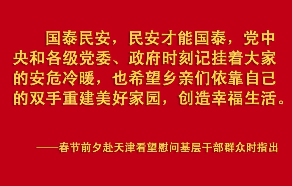 春節(jié)前夕,習(xí)近平總書(shū)記在天津考察調(diào)研,看望慰問(wèn)基層干部群眾。2月1日上午,他首先來(lái)到西青區(qū)辛口鎮(zhèn)第六埠村,實(shí)地了解去年洪澇災(zāi)害后當(dāng)?shù)剞r(nóng)業(yè)生產(chǎn)恢復(fù)等情況,看望受災(zāi)群眾。
