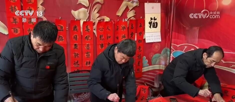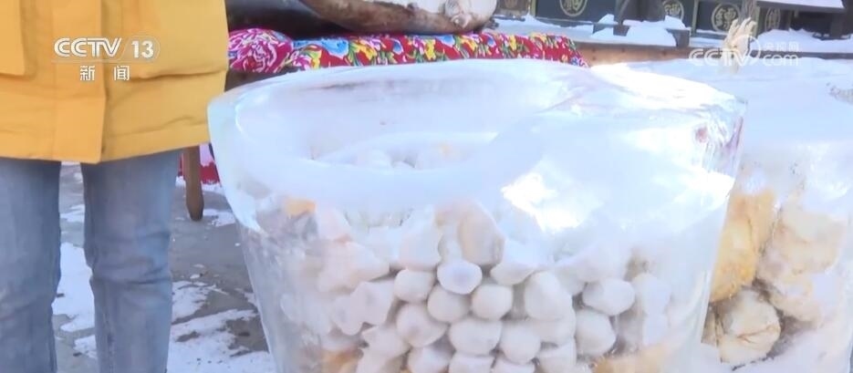 不僅是商品非常有特色,大家來看,這個裝粘豆包的大缸非常結(jié)實,晶瑩剔透。它是用水桶為模具,內(nèi)部裝水,在室外凍上一個晚上,脫模后就成了一個天然冰箱,在鄉(xiāng)村,各家年貨、凍貨都可以儲存在這里,整個冬天都沒有問題,既保鮮又節(jié)約空間。大集上,還有對聯(lián)、福字、鄉(xiāng)村土特產(chǎn),充滿濃濃的鄉(xiāng)土氣息。