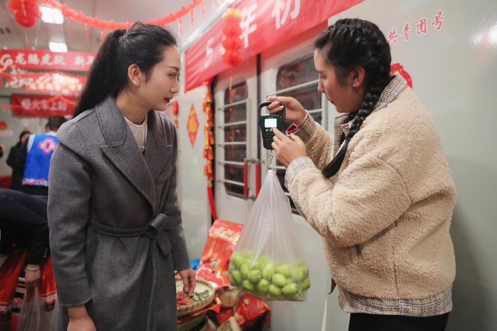 春節(jié)臨近,家家戶戶忙著采買年貨。中國鐵路昆明局集團有限公司在云南昆明至元謀西的公益性“慢火車”7466/5次列車上辦起了年貨街。