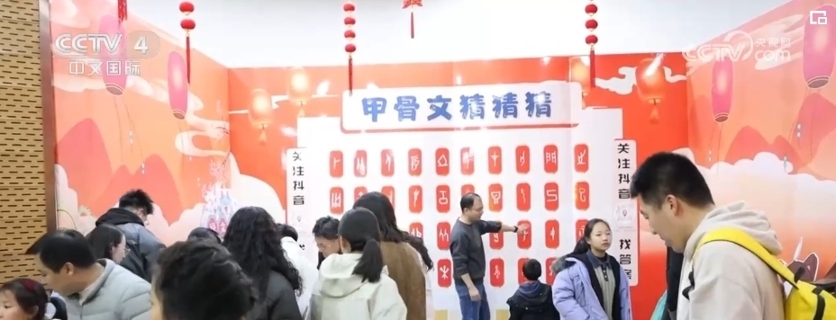 博物館內(nèi)的漢字展、漢服秀、甲骨文韻律操、文創(chuàng)集市等豐富多彩的節(jié)目,也給游客帶來了不一樣的新春體驗(yàn)和感受。識讀甲骨文,能讓大家對漢字演變過程有更加直觀的認(rèn)識和了解,在“甲骨文猜猜猜”游戲中,游客們認(rèn)真觀察、思考展板上一個(gè)個(gè)甲骨文所對應(yīng)的漢字,感受著古人的智慧和漢字的靈性與博大。