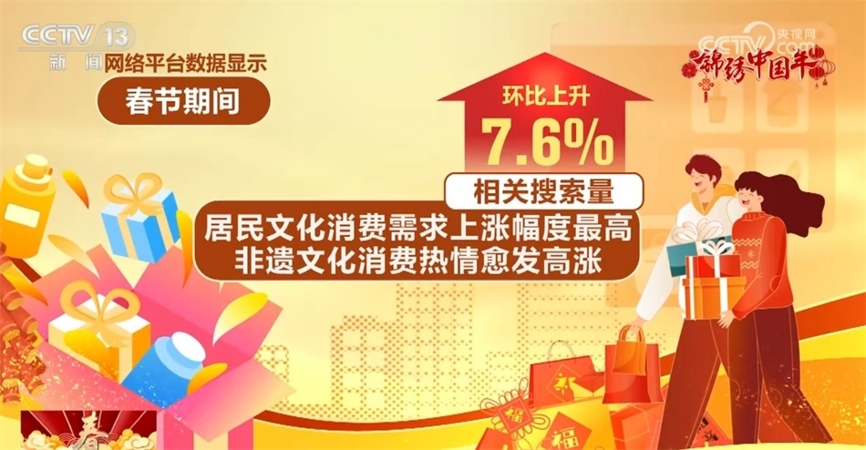 網(wǎng)絡平臺數(shù)據(jù)顯示,春節(jié)期間,居民文化消費需求上漲幅度最高,非遺文化消費熱情愈發(fā)高漲,相關搜索量環(huán)比上升7.6%。其中,非遺廟會、燈會最受游客歡迎。
