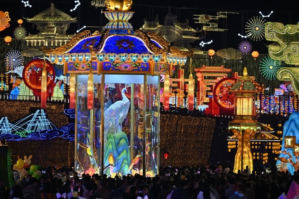 在四川自貢,3萬多名游客走進(jìn)“中國燈城”自貢中華彩燈大世界,觀彩燈、賞演藝、拍全家福??罩?,600架無人機(jī)排列出湯圓、舞龍燈等圖樣;地面,舞龍舞獅等民俗表演輪番上演,上百名身著漢服的演員手提花燈巡游……