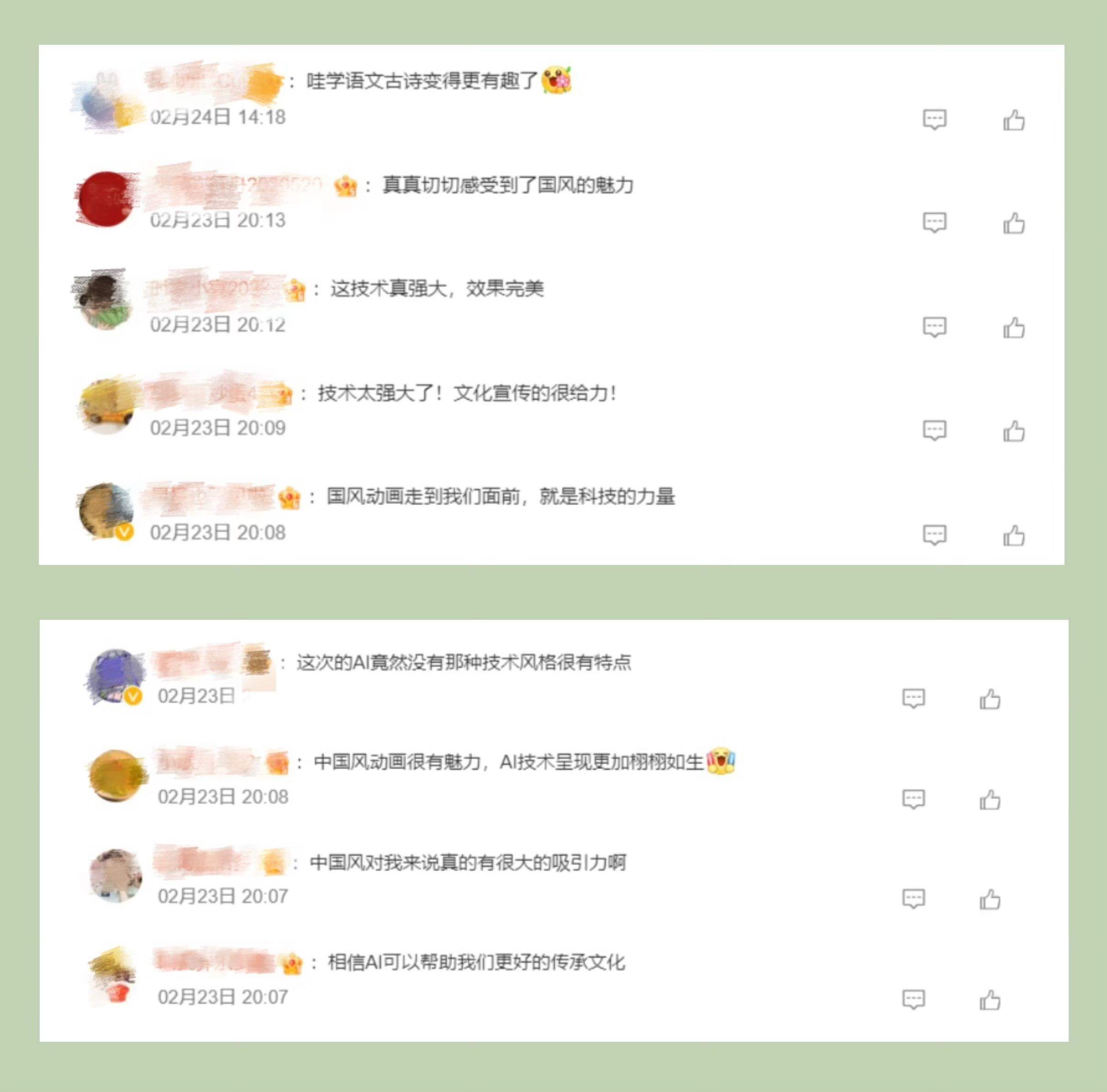 節(jié)目探索詩畫融通的國風(fēng)動(dòng)畫片新呈現(xiàn),讓廣大青少年進(jìn)一步加深了對中國經(jīng)典詩詞的理解和喜愛?!癆I”“總臺”“千秋詩頌”等成為網(wǎng)友熱議高頻詞。截至2月27日20:00,話題#千秋詩頌#閱讀量超791萬次。網(wǎng)友紛紛留言:“看到這個(gè)系列片,我真的深深感受到了中國傳統(tǒng)文化的深厚底蘊(yùn)。這些古詩詞深入骨髓,流淌在我們的血液中,是我們國家的文化符號”“以AI為媒,央視制作的這部國風(fēng)動(dòng)畫片傳承了經(jīng)典,喚醒了古韻的新生命”“唯美的畫面讓人動(dòng)容,用視覺的形式了解《別董大》這一首古老的詩歌更別有一番韻味”“這種科技與動(dòng)畫片的結(jié)合,恰好是現(xiàn)在小朋友們和大朋友們所需要的”。