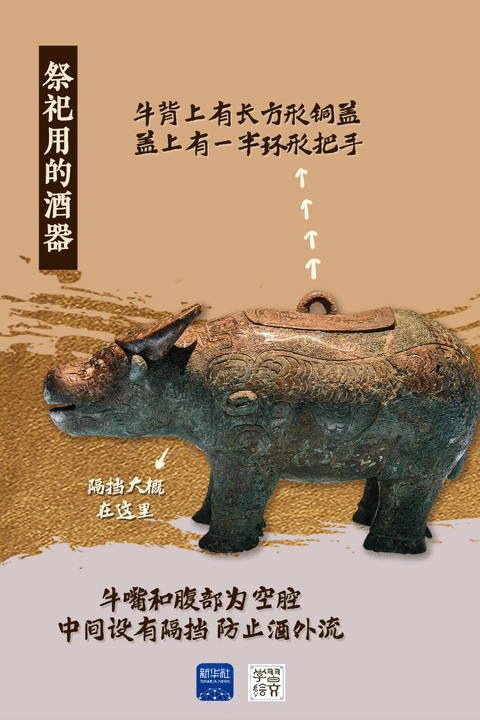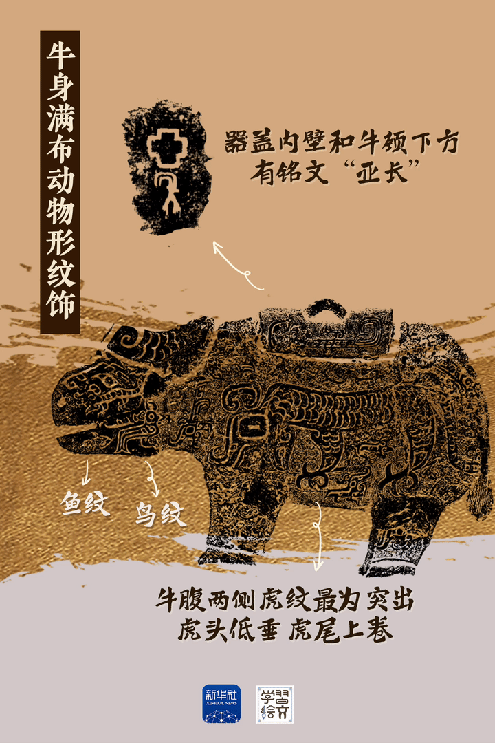 亞長牛尊是截至目前殷墟發(fā)現(xiàn)的唯一一件牛形青銅容器。“亞”是武官的稱謂,“長”是家族姓氏,墓主人亞長是商王朝南部“長”國的部落首領(lǐng)。