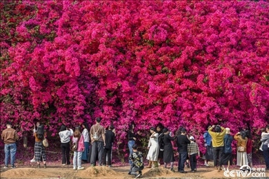 2024年3月8日,廣東惠州仲愷區(qū)潼湖鎮(zhèn)的一處古村落魚塘邊現(xiàn)百米長(zhǎng)簕杜鵑花墻,吸引游客爭(zhēng)相拍照。