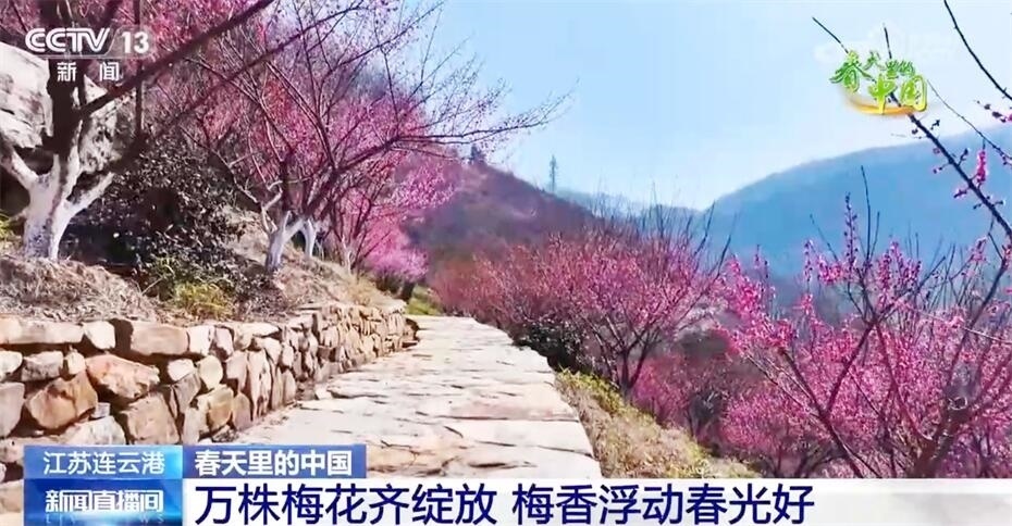 春日暖陽中,江蘇連云港花果山漫山遍野的梅花悄然綻放,紅梅花開似海、明媚驚艷,遠看如云霞燦爛,近聞有盈袖暗香?;ü矫穲@經過多年的栽植培育,有紅梅、美人梅、綠萼梅等梅樹2萬多株。
