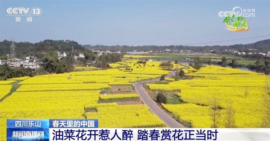 遠眺峨眉山,近看峨眉河,萬頃金波花如海,流金溢彩百里香?,F在我們看到的是四川樂山市中區(qū) 永和村的近千畝油菜花,在陽光照射下,猶如斑斕的綢帶,妝點了峨眉河沿岸五彩的山色春光。趁著晴好天氣,市民、游客來到戶外踏青賞景,在花田中徜徉流連,感受春日美好時光。