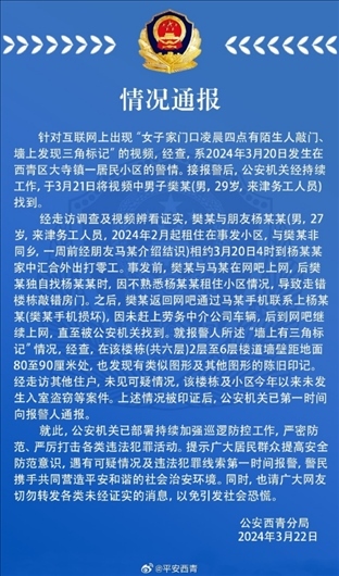 ·天津警方通報網(wǎng)傳“女子家門口發(fā)現(xiàn)三角標記”。